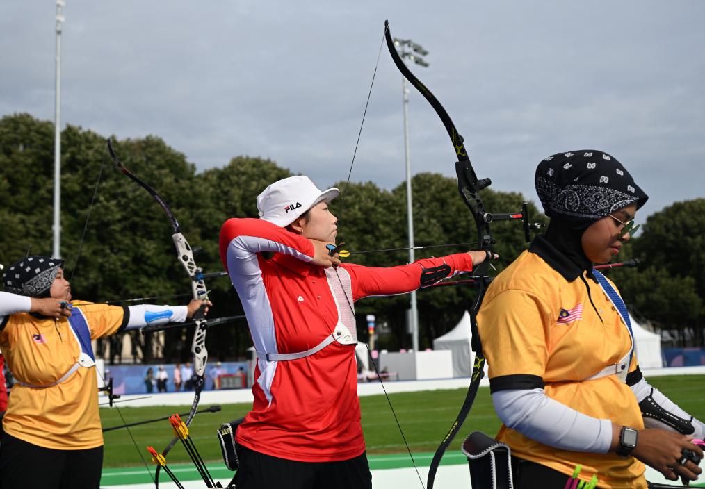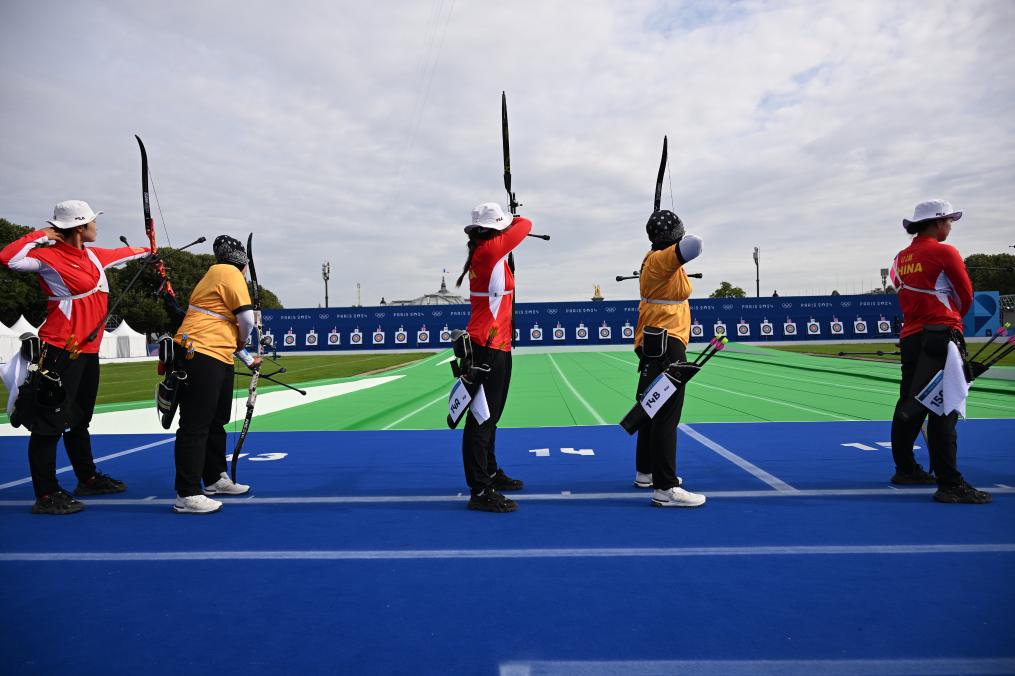 7月25日,巴黎奧運(yùn)會(huì)射箭女子個(gè)人排位賽在巴黎榮軍院舉行,中國(guó)選手楊曉蕾(中)在比賽中。新華社記者 賀燦鈴 攝