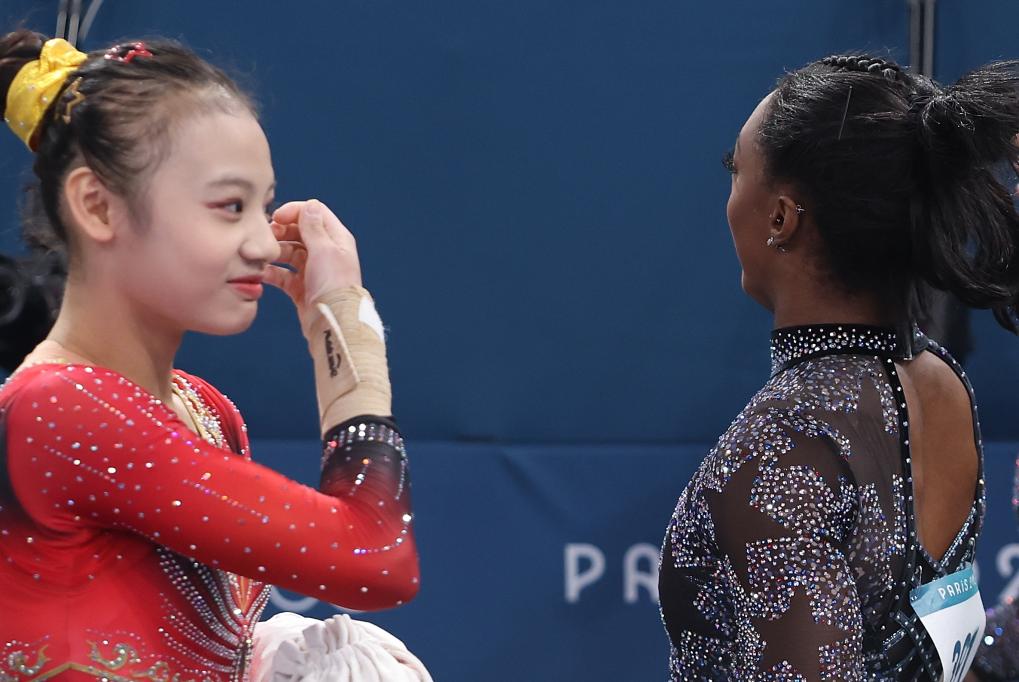 7月28日,美國選手拜爾斯(右)與中國選手邱祺緣在轉(zhuǎn)換項目。當(dāng)日,巴黎奧運會體操女子資格賽在貝爾西體育館舉行。 新華社記者 曹燦 攝