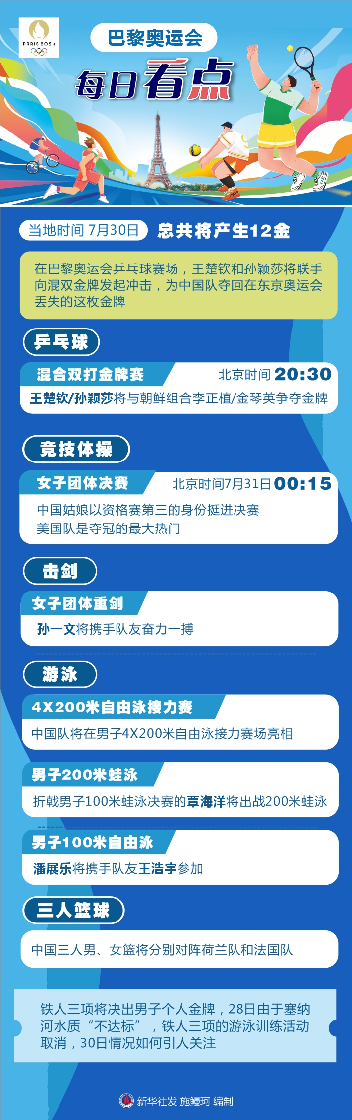 還有一些項目將拉開戰(zhàn)幕。中國三人男、女籃將分別對陣荷蘭隊和法國隊。鐵人三項將決出男子個人金牌,28日由于塞納河水質(zhì)“不達標(biāo)”,鐵人三項的游泳訓(xùn)練活動取消,30日情況如何引人關(guān)注。