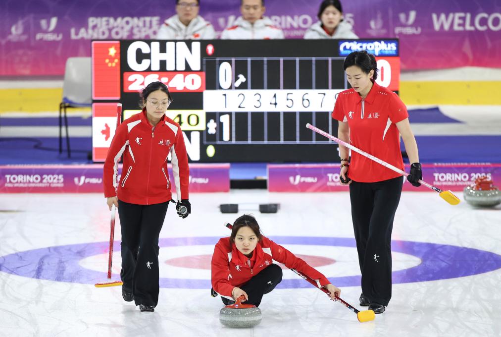 同樣在塔佐利冰上運(yùn)動(dòng)中心進(jìn)行的還有冰壺比賽,由北京體育大學(xué)學(xué)生尹子怡、渠偌萱、譚斯婷、裴君杭、葉紫萱組成的中國(guó)女隊(duì),先是在白天的比賽中以4:6不敵日本隊(duì),隨后又在晚間的最后一輪循環(huán)賽中以3:6不敵加拿大隊(duì),最終以5勝4負(fù)的成績(jī)排名循環(huán)賽第五,無緣四強(qiáng)。