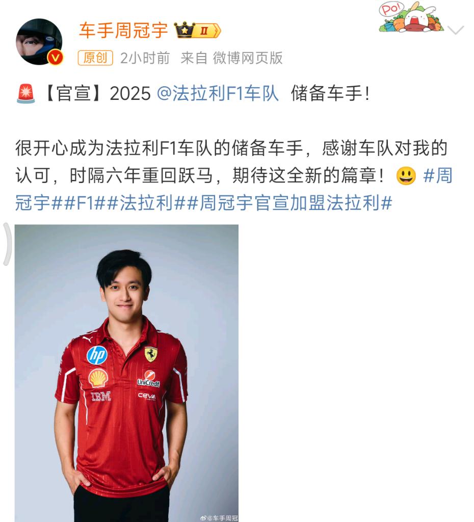 周冠宇通過(guò)個(gè)人社交平臺(tái)表示:“很開心成為法拉利F1車隊(duì)的儲(chǔ)備車手,感謝車隊(duì)對(duì)我的認(rèn)可,時(shí)隔六年重回‘躍馬’,期待這全新的篇章!”2015年至2018年間,周冠宇曾在法拉利青訓(xùn)學(xué)院度過(guò)四年時(shí)光。