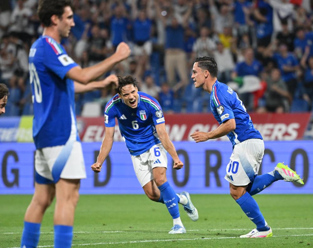 6月9日,意大利隊球員拉斯帕多里(右)慶祝進球。新華社發(fā)(阿爾貝托·林格利亞攝)