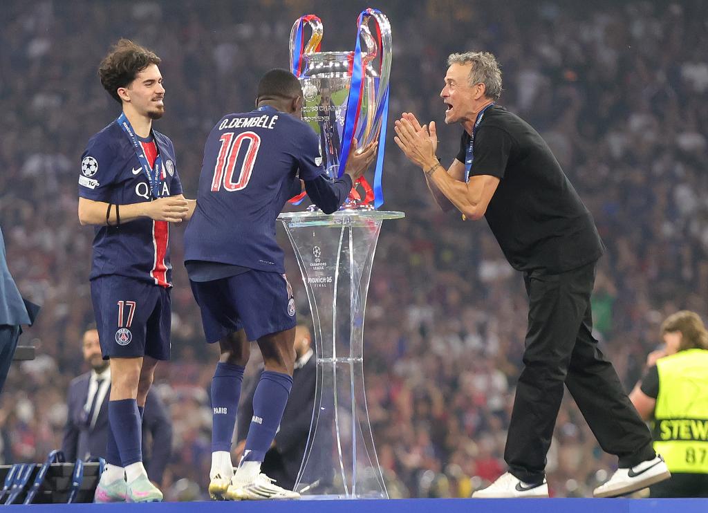 5月31日,巴黎圣日耳曼隊主教練恩里克(右)與球員登貝萊(中)、維蒂尼亞慶祝。當(dāng)日,在德國慕尼黑進(jìn)行的2024-2025賽季歐冠聯(lián)賽決賽中,法甲巴黎圣日耳曼隊5比0擊敗意甲國際米蘭隊,收獲隊史第一座歐冠冠軍獎杯。新華社發(fā)(菲利普·魯伊茲攝)