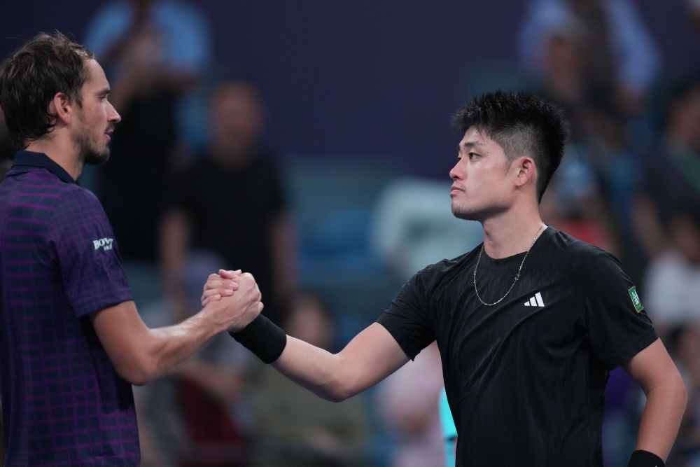 9月21日,吳易昺(右)獲勝后與梅德韋杰夫握手致意。新華社記者 黃宗治 攝