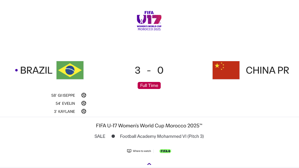 新華社拉巴特10月28日電 在28日進(jìn)行的2025年U17摩洛哥女足世界杯八分之一決賽中,中國隊以0:3負(fù)于巴西隊,無緣八強(qiáng)。