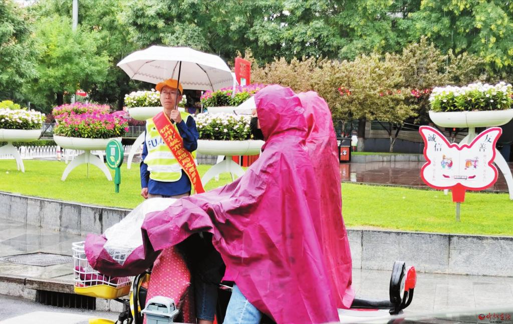 8月31日7點40分,我市城市管理局志愿者早早來到執(zhí)勤崗位,在風雨中配合交警在長征街與七一路口維持交通秩序,對橫穿馬路、亂闖紅燈等不文明交通行為進行勸導(dǎo),引導(dǎo)市民遵守交通法規(guī),提高安全意識,用實際行動為創(chuàng)建文明城市做貢獻。曹建華 攝