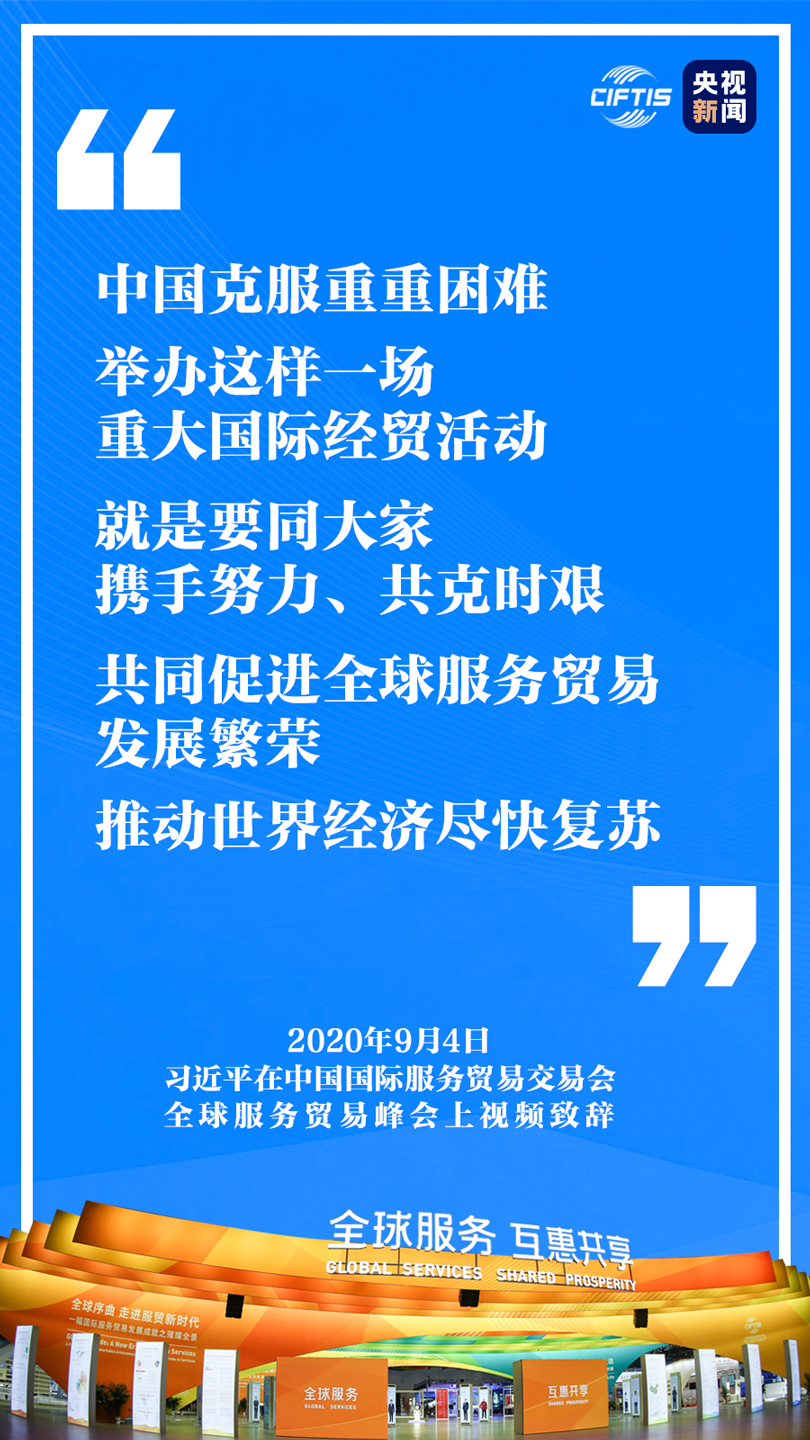 中國克服重重困難,舉辦這樣一場重大國際經(jīng)貿(mào)活動,就是要同大家攜手努力、共克時艱,共同促進全球服務(wù)貿(mào)易發(fā)展繁榮,推動世界經(jīng)濟盡快復(fù)蘇。