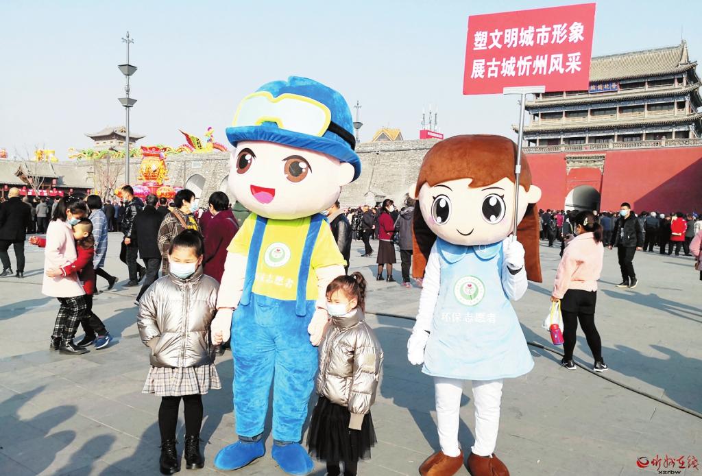 | 忻州古城卡通形象裝扮的環(huán)保志愿者向群眾宣傳環(huán)保政策法規(guī) |