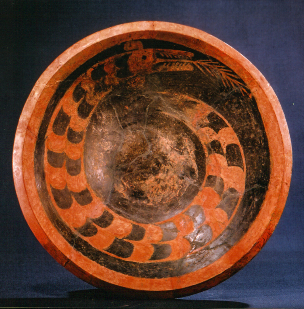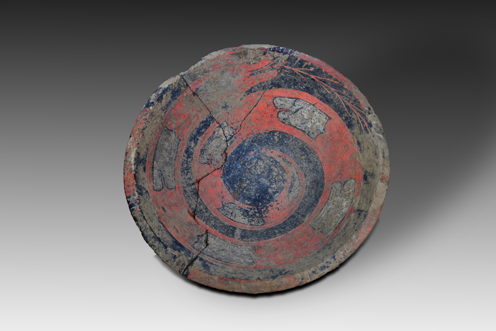 彩繪龍盤于1980年出土于陶寺遺址,灰褐色陶胎,敞口、折腹、平底,通體磨光。盤底用紅彩涂色,紅灰相間的蟠龍圍繞紅色圓盤面盤旋,蟠龍身盤如蛇,體上有似鱷魚一樣的鱗狀斑紋,口銜枝狀物,專家辨識(shí)后認(rèn)為是禾苗。