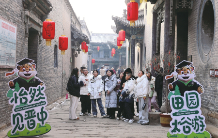 ④2月1日,太谷三多堂博物館,外地游客傾聽導(dǎo)游講述晉商創(chuàng)業(yè)故事。