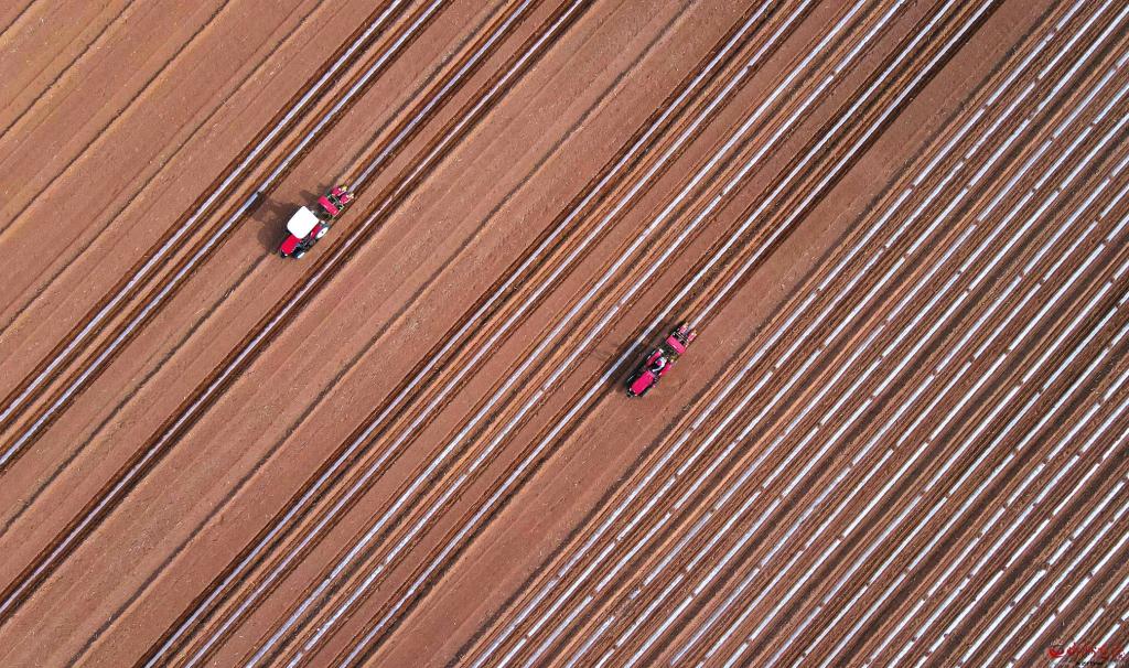 4月21日,在忻州民宇農(nóng)業(yè)甜糯玉米標(biāo)準(zhǔn)化種植基地,兩臺玉米膜側(cè)播種機(jī)聯(lián)合作業(yè),搶農(nóng)時進(jìn)行播種。近年來,該基地采用玉米膜側(cè)播種綜合栽培技術(shù)進(jìn)行播種,有效解決了高溫導(dǎo)致玉米早衰等問題,提高了降水利用率,增加了玉米產(chǎn)量。 (張存良攝