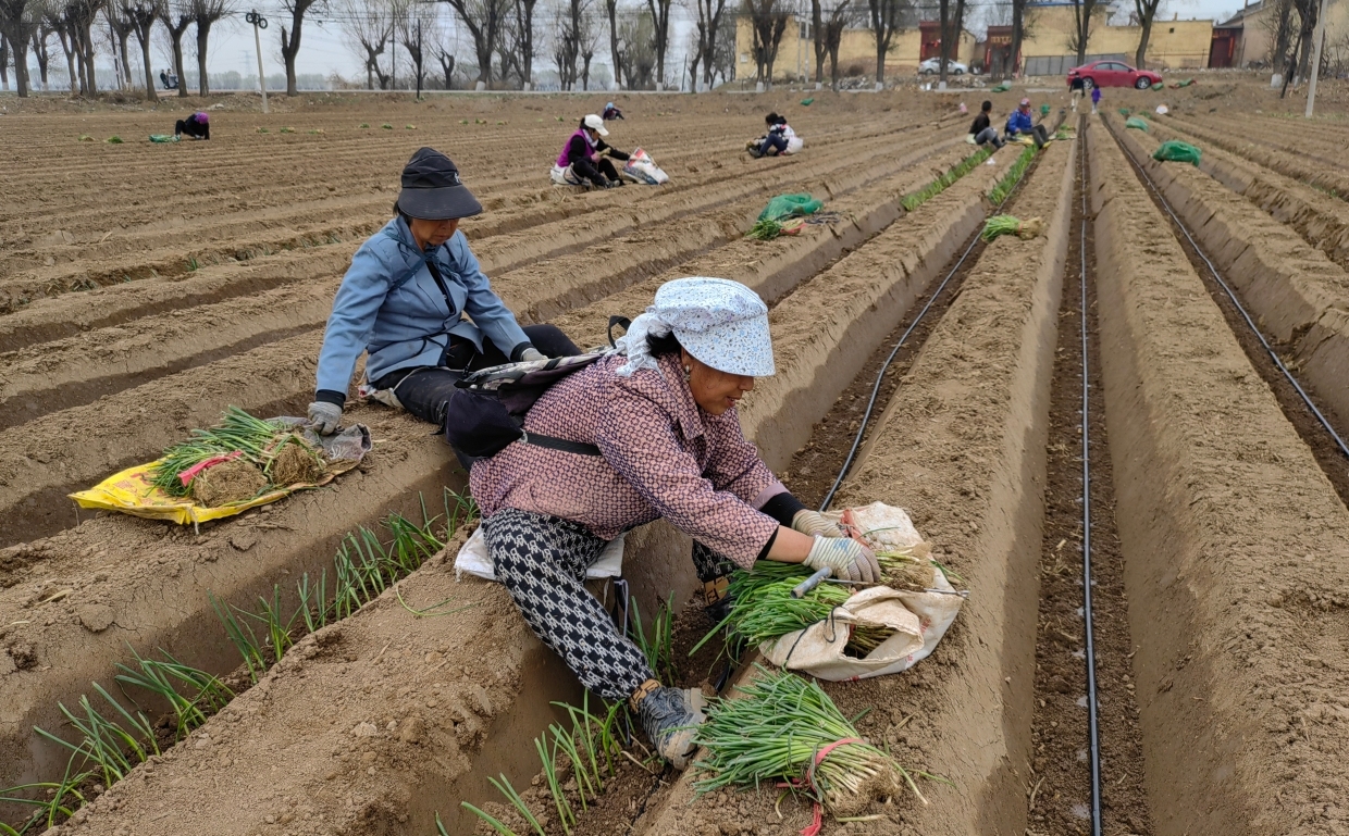 4月6日,定襄縣黃咀村寬廣的農(nóng)田里,村民正熟練地進行蔥苗種植。