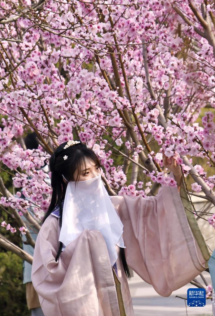 4月4日,一名身著漢服的姑娘在豐臺(tái)區(qū)世界花卉大觀園內(nèi)賞花拍照。(新華社記者 李欣 攝)