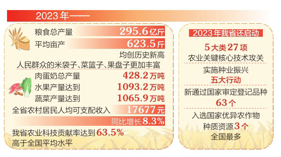 一分耕耘一分收獲。近年來,我省糧食和重要農(nóng)產(chǎn)品生產(chǎn)穩(wěn)定、供給充足,農(nóng)業(yè)農(nóng)村現(xiàn)代化不斷邁出新步伐。2023年,糧食總產(chǎn)量295.6億斤,平均畝產(chǎn)623.5斤,均創(chuàng)歷史新高;人民群眾的米袋子、菜籃子、果盤子更加豐富,肉蛋奶總產(chǎn)量428.2萬噸,水果、蔬菜產(chǎn)量分別達(dá)到1093.2萬噸、1065.9萬噸;全省農(nóng)村居民人均可支配收入17677元,同比增長(zhǎng)8.3%。這些成績(jī)的取得,得益于科技賦能助力。2023年我省農(nóng)業(yè)科技貢獻(xiàn)率達(dá)到63.5%,高于全國(guó)平均水平。