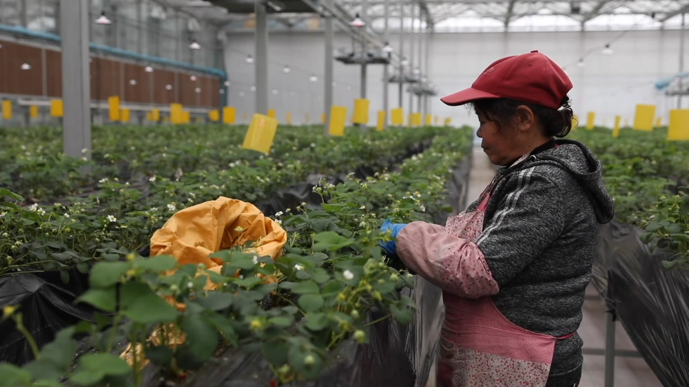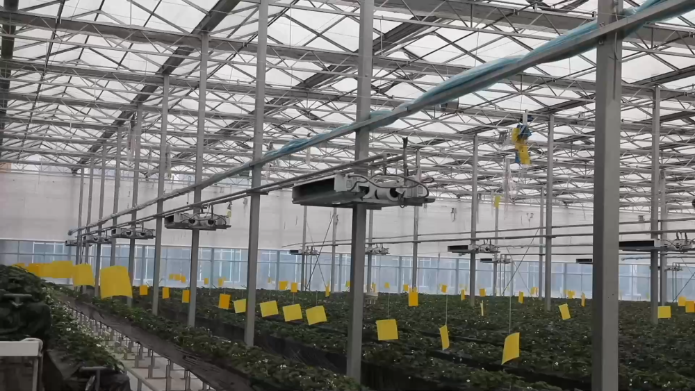 智慧農(nóng)場玻璃溫室現(xiàn)共種植三個品種、八萬株草莓,均為自主繁育的草莓苗??茖W(xué)種植促進(jìn)了豐產(chǎn),兩座玻璃溫室均可實(shí)現(xiàn)一年四季連續(xù)生產(chǎn)。