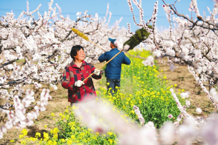 3月19日,永濟市韓陽鎮(zhèn)長旺村杏園里,杏農(nóng)正在對杏花進行授粉作業(yè)。李向東攝