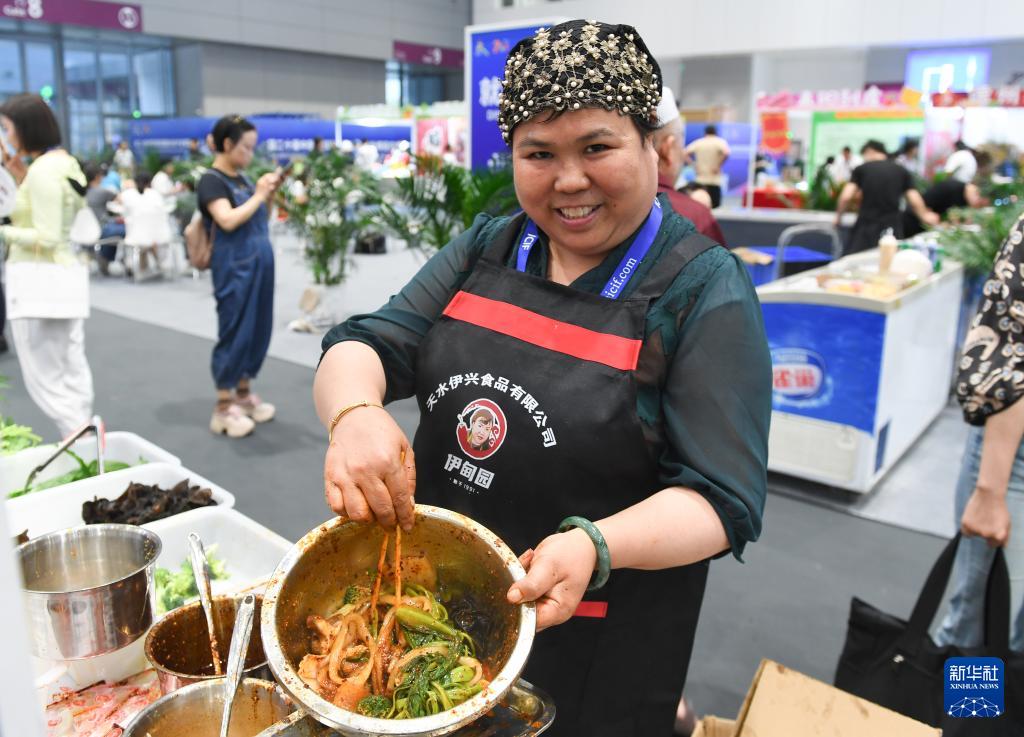 5月23日,來自甘肅天水的參展商在第二十屆文博會(huì)現(xiàn)場展示天水麻辣燙。(新華社記者 毛思倩 攝)