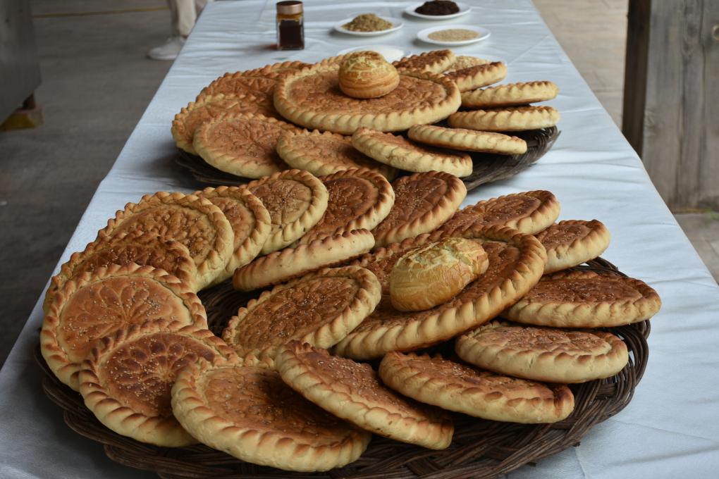 張小女制作的“大團圓”月餅體現(xiàn)了當?shù)靥厣?。澤州粗月餅看上去像一個鎖著花邊的圓形面餅,內(nèi)包兩層冰糖、花生、葡萄干、核桃仁等雜碎餡料,表面裝飾圖案,或蒸或烤而成。講究的圖案比較復雜,但張小女喜歡在村口拔棵野草,洗干凈后,印在上面,充滿野趣。