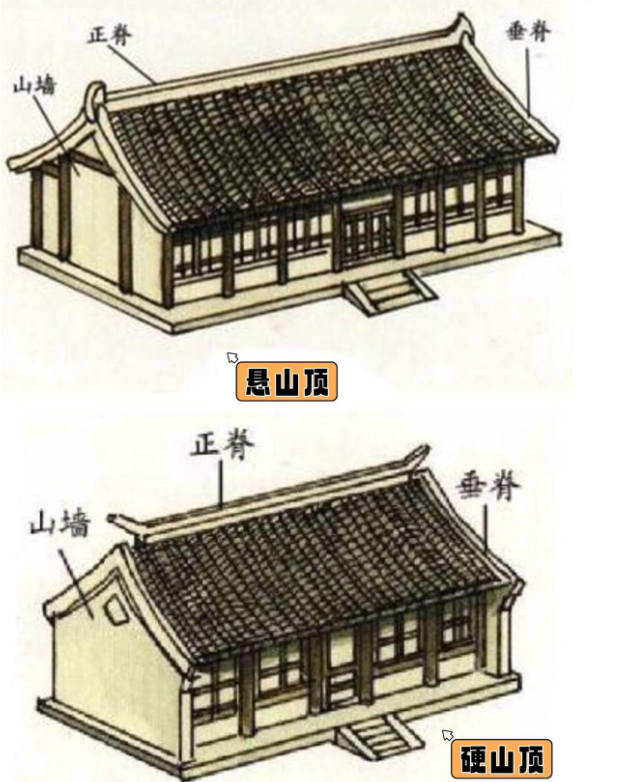 歇山頂|圖為五臺縣南禪寺大殿 【懸山頂】VS【硬山頂】 相比于【廡殿頂】和【歇山頂】 這兩個“招式”廣泛應用于民間 【懸山頂】比【硬山頂】更高一級 它們都有一條正脊 四條垂脊和兩個坡面 不同之處在于 房屋兩側(cè)的山墻與屋頂?shù)奈恢藐P系 了解區(qū)別之前 先為大家介紹一個新名詞——“山墻” 即用來支承人字形屋頂兩頭的墻