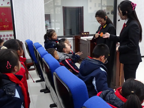在審判法庭,法院干警深入淺出地向?qū)W生們介紹了法庭的分設(shè)區(qū)域、庭審流程、訴訟參與人、法槌起源和具體的使用方法。通過(guò)互換角色的“沉浸式”體驗(yàn),法律不僅僅是教科書中枯燥無(wú)味的文字,法庭的莊重與法律的嚴(yán)謹(jǐn)已化作一幅幅生動(dòng)的畫面,深深烙印在他們的記憶中。