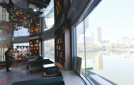 4月9日,依省城文瀛湖而建的太原新華書店文瀛城市書房中,讀者在靜謐中品味書香。