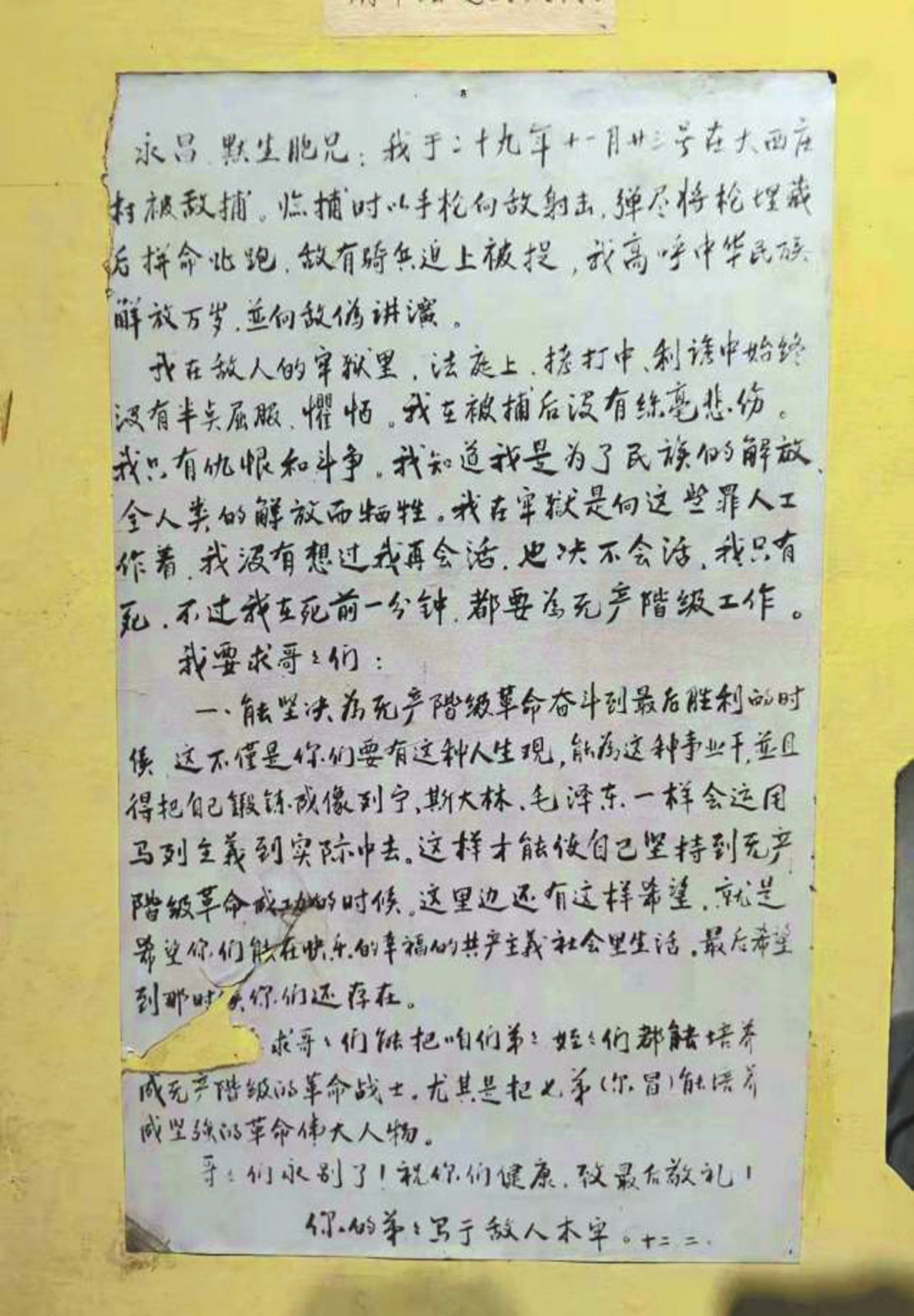 遺書中,表達(dá)了對(duì)抗戰(zhàn)勝利的必勝信心;直言“我死了是為國家為民族而犧牲”,以生命詮釋對(duì)黨的忠誠,展現(xiàn)了共產(chǎn)黨人堅(jiān)貞不屈的崇高革命精神與為共產(chǎn)主義奮斗終身的犧牲精神。